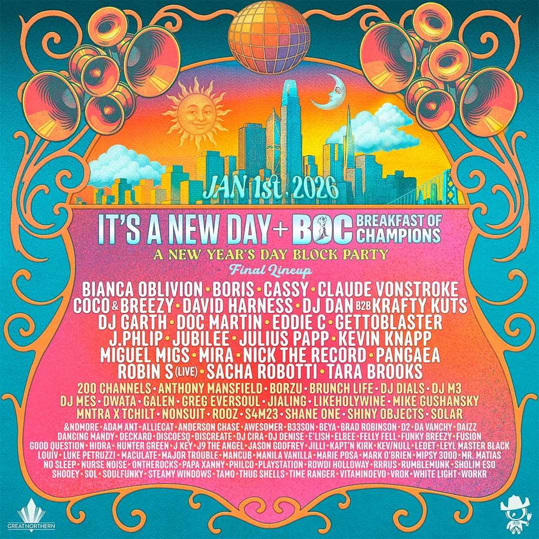 Ah yes, another music extravaganza at the annual “It’s A New Day + BOC (Breakfast of Champions) block party which lands at The Great Northern on New Year’s Day - we’ll welcome 2026 with a stacked lineup of DJs…happy to be a part of this New Year’s Day tradition, which is always an early highlight in the new year…