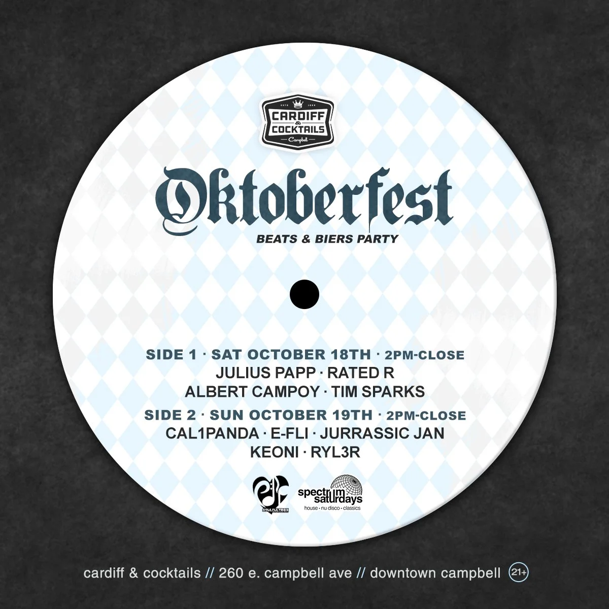 This weekend in downtown Campbell, OCTOBERFEST celebrations take over and we’ll be at The Cardiff for two full days of music starting at 2pm…I’ll be jump-starting the afternoon on Saturday with my traditional Yacht Rock / Classic Rock set flowing into House Music rhythms that will continue into the evening with Raul, Albert and Tim  …I finally may have to eat a Bratwurst!