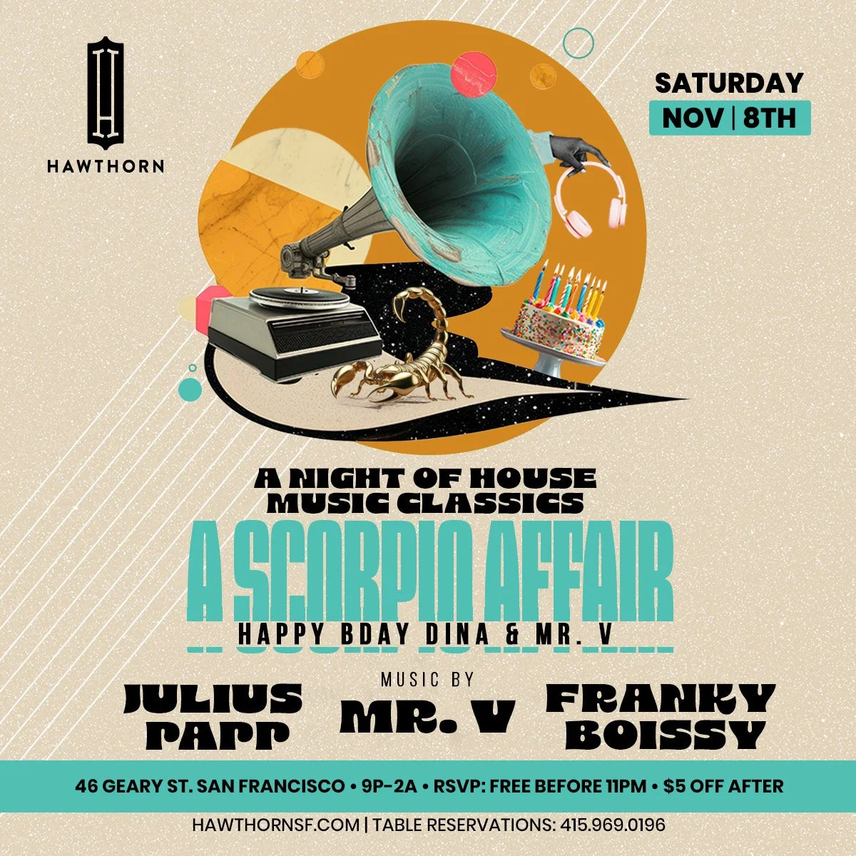 If you’re venturing out in San Francisco this Friday evening, join me in the Bonaparte Room at Hawthorn for an all night, House Music affair… I’ll be playing from 10pm until close featuring a mix of Deep House, Afro House, Soulful House and Disco House…and let’s not forget about the main room featuring DJ Clee - he’ll be playing an open format music set so you’ll get a dose of across the board music…you can RSVP for Free entry before 11pm at HAWTHORNSF.COM